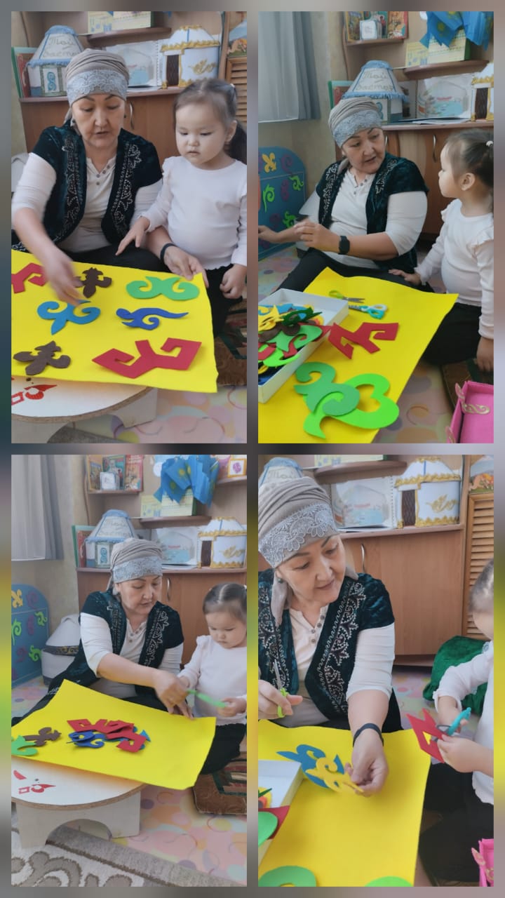 Әжеміз ұлттық ою-өрнек түрлерімен таныстырып, бірге өрнек құрастырып, салт-дәстүрдің маңызын түсіндірді.