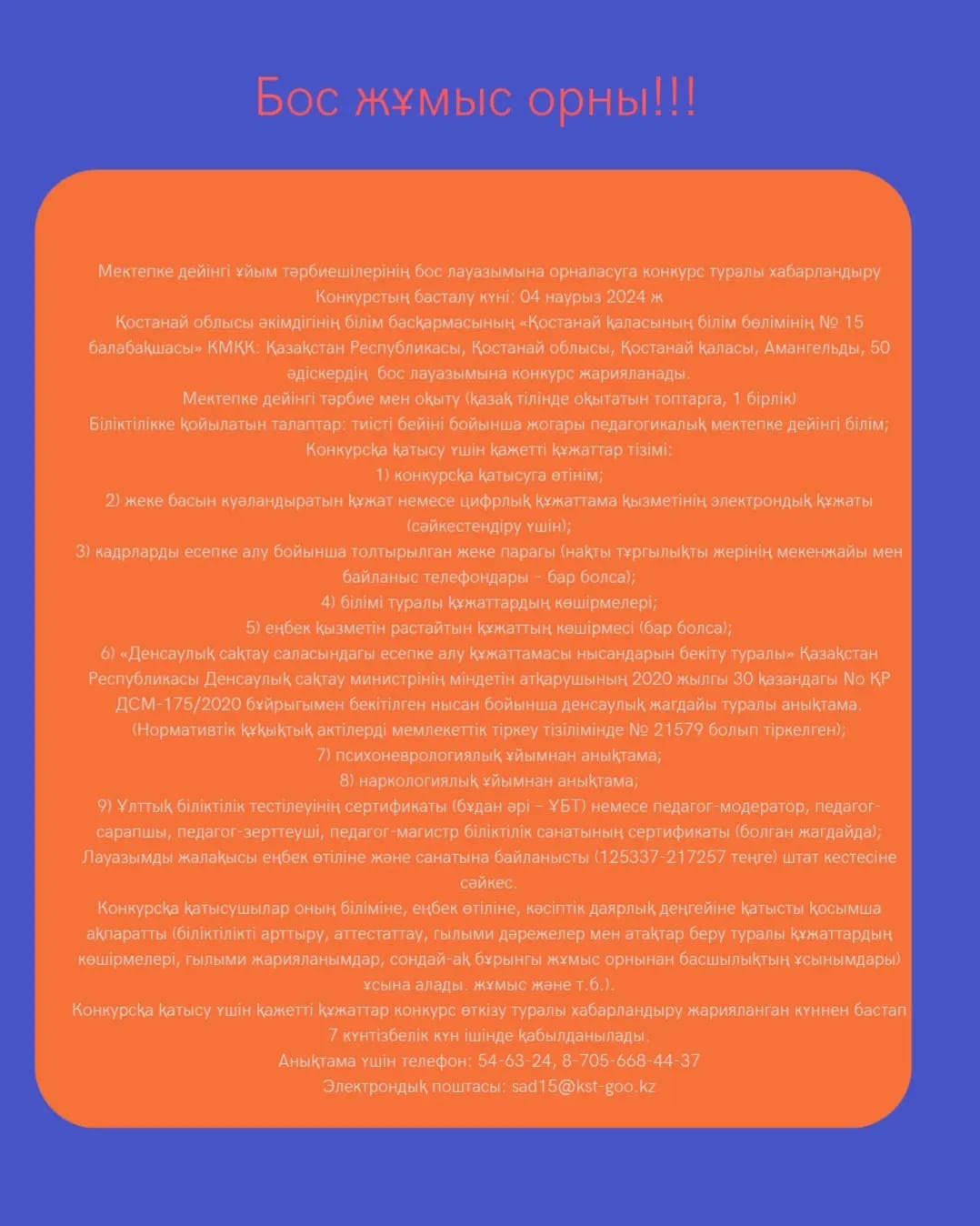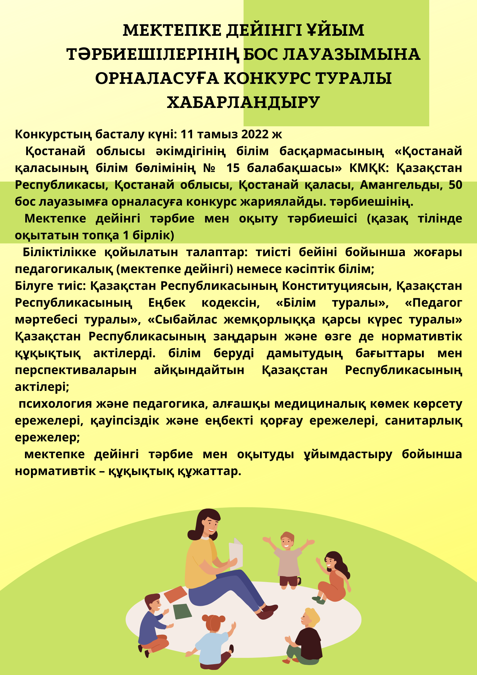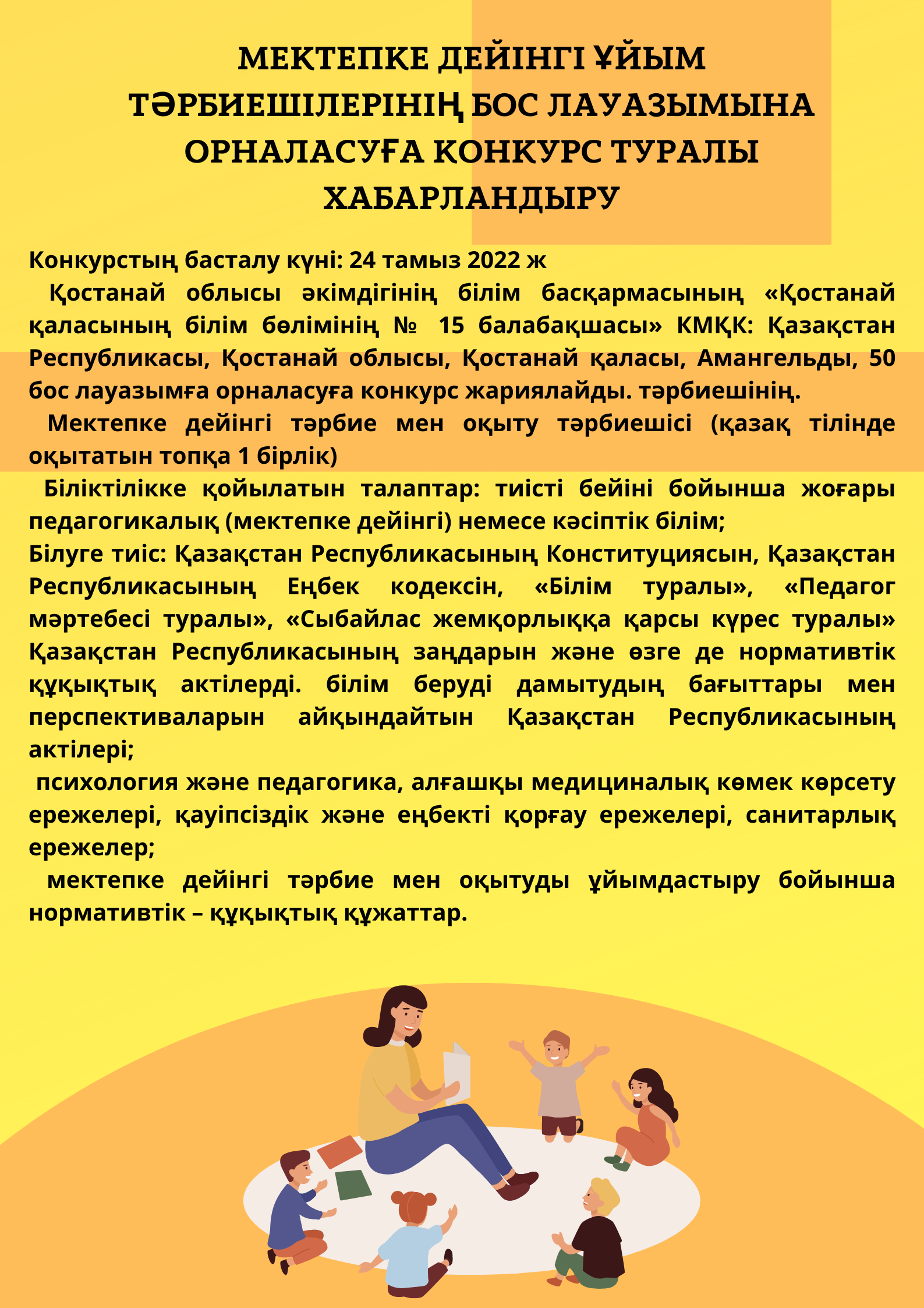 Қостанай облысы әкімдігінің білім басқармасының «Қостанай қаласының білім бөлімінің № 15 балабақшасы» КМҚК: Қазақстан Республикасы, Қостанай облысы, Қостанай қаласы, Амангельды, 50 тәрбиешінің бос лауазымына конкурс жарияланады.