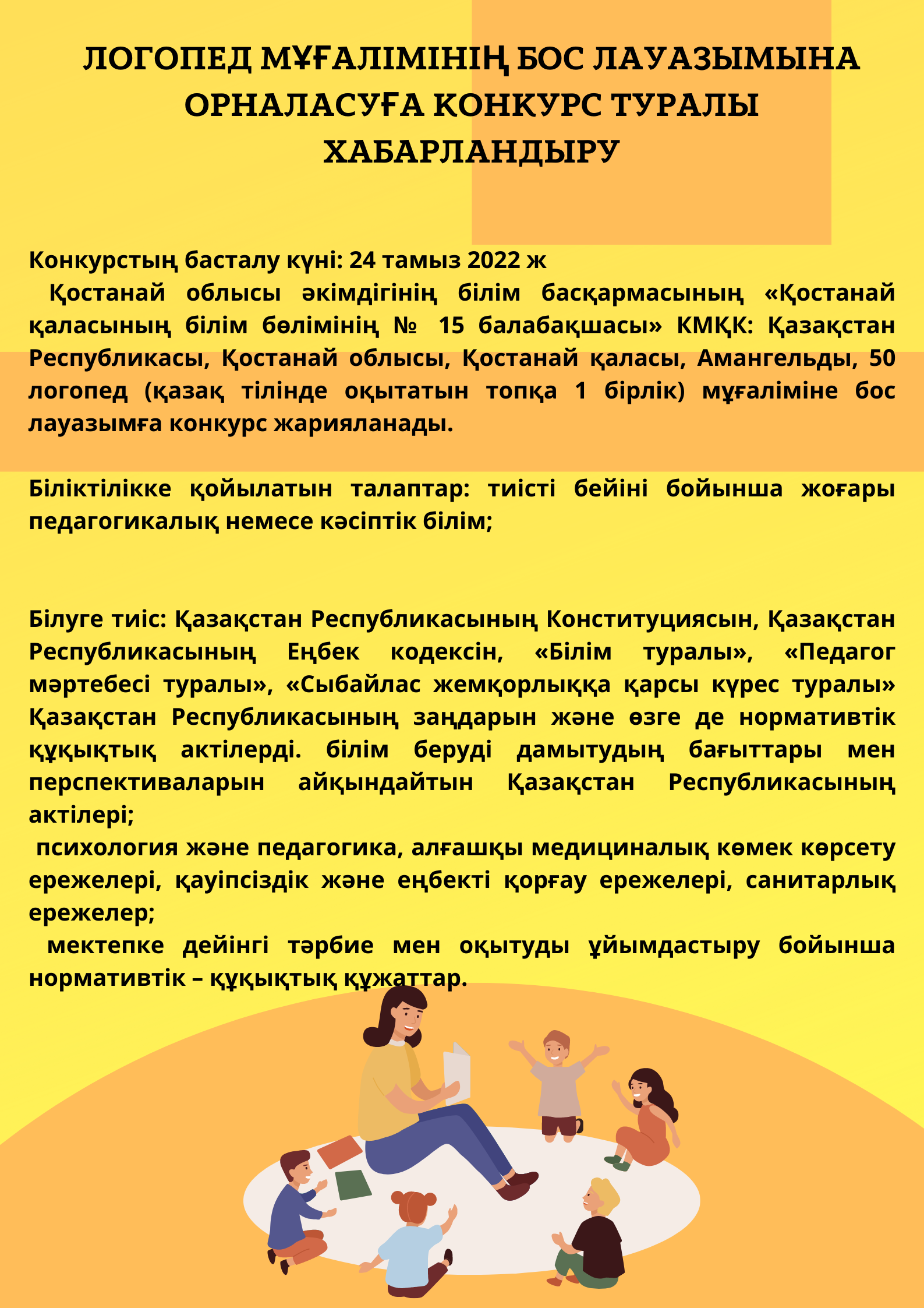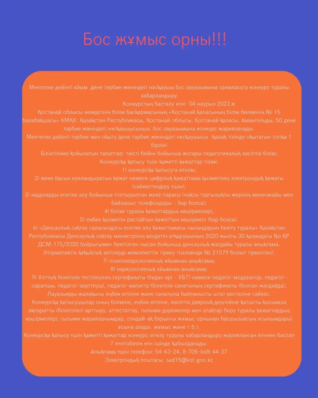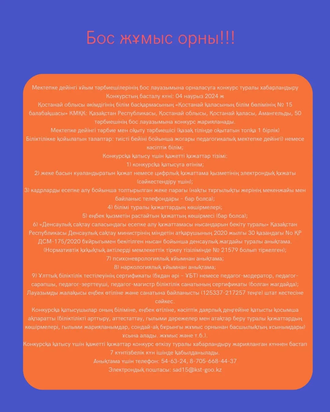 Қостанай облысы әкімдігінің білім басқармасының «Қостанай қаласының білім бөлімінің № 15 балабақшасы» КМҚК: Қазақстан Республикасы, Қостанай облысы, Қостанай қаласы, Амангельды, 50 тәрбиешінің бос лауазымына конкурс жарияланады.
