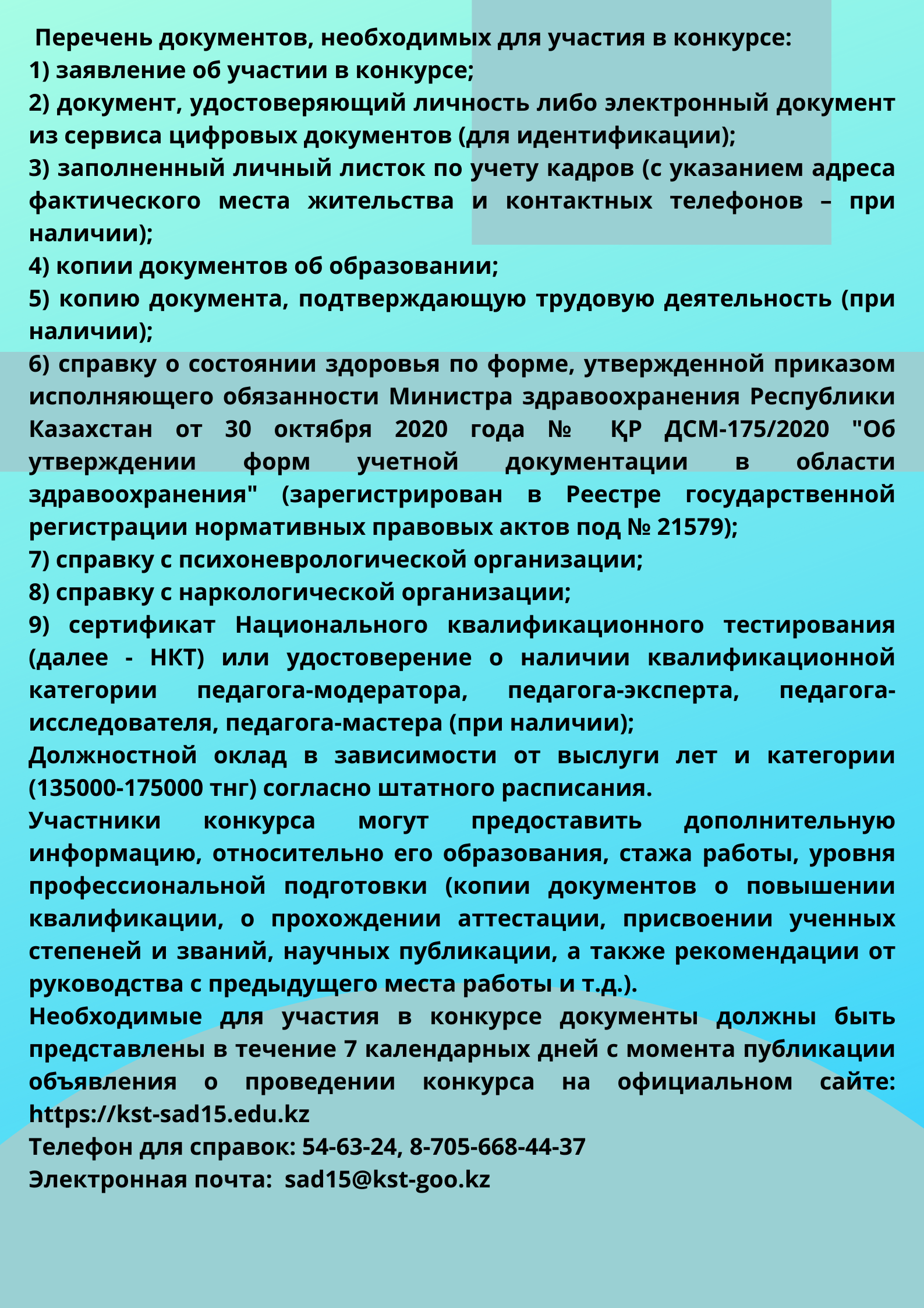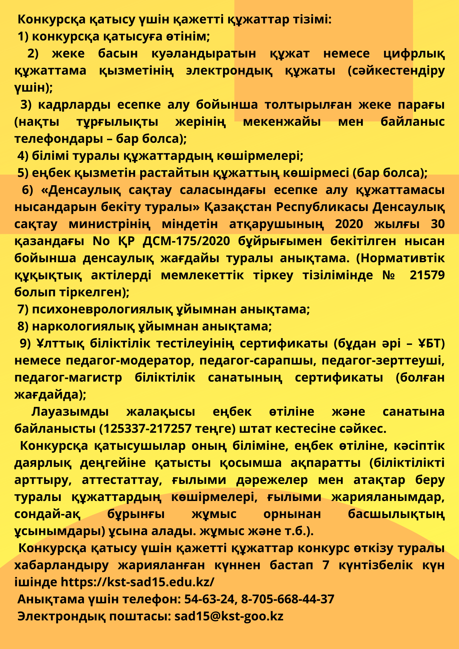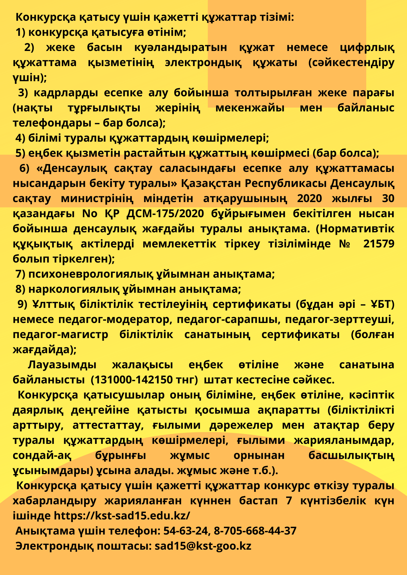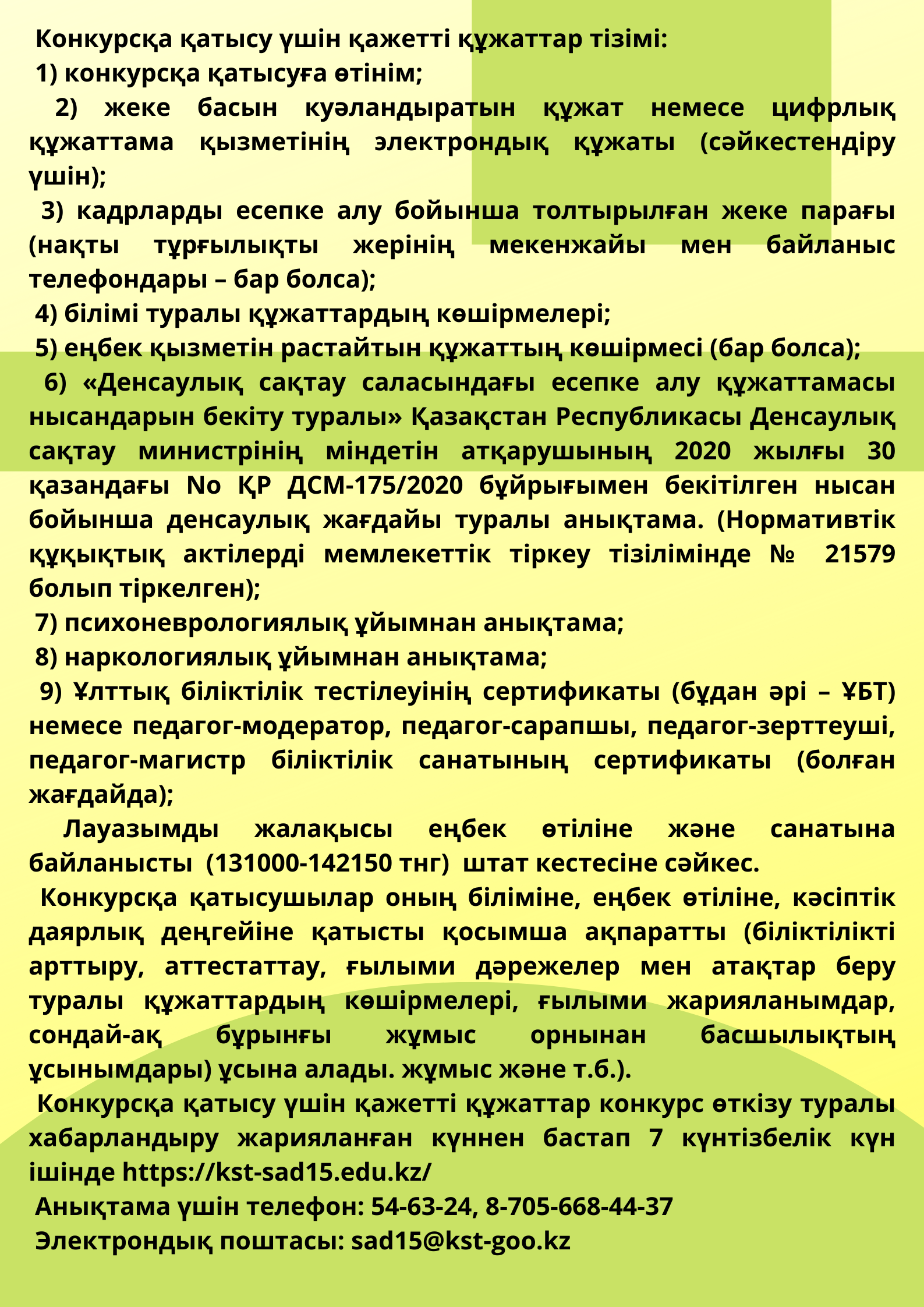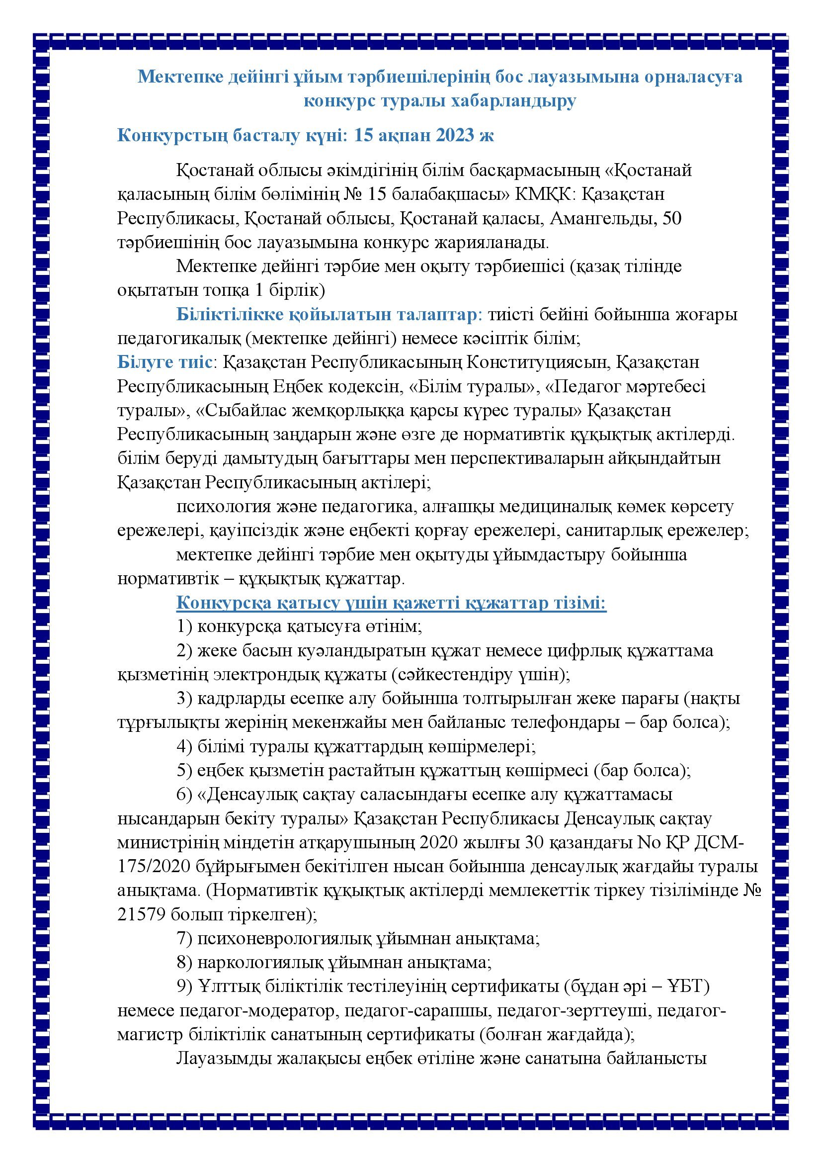 Конкурсқа қатысу үшін қажетті құжаттар конкурс өткізу туралы хабарландыру жарияланған күннен бастап 7 күнтізбелік күн ішінде: https://kst-sad15.edu.kz/