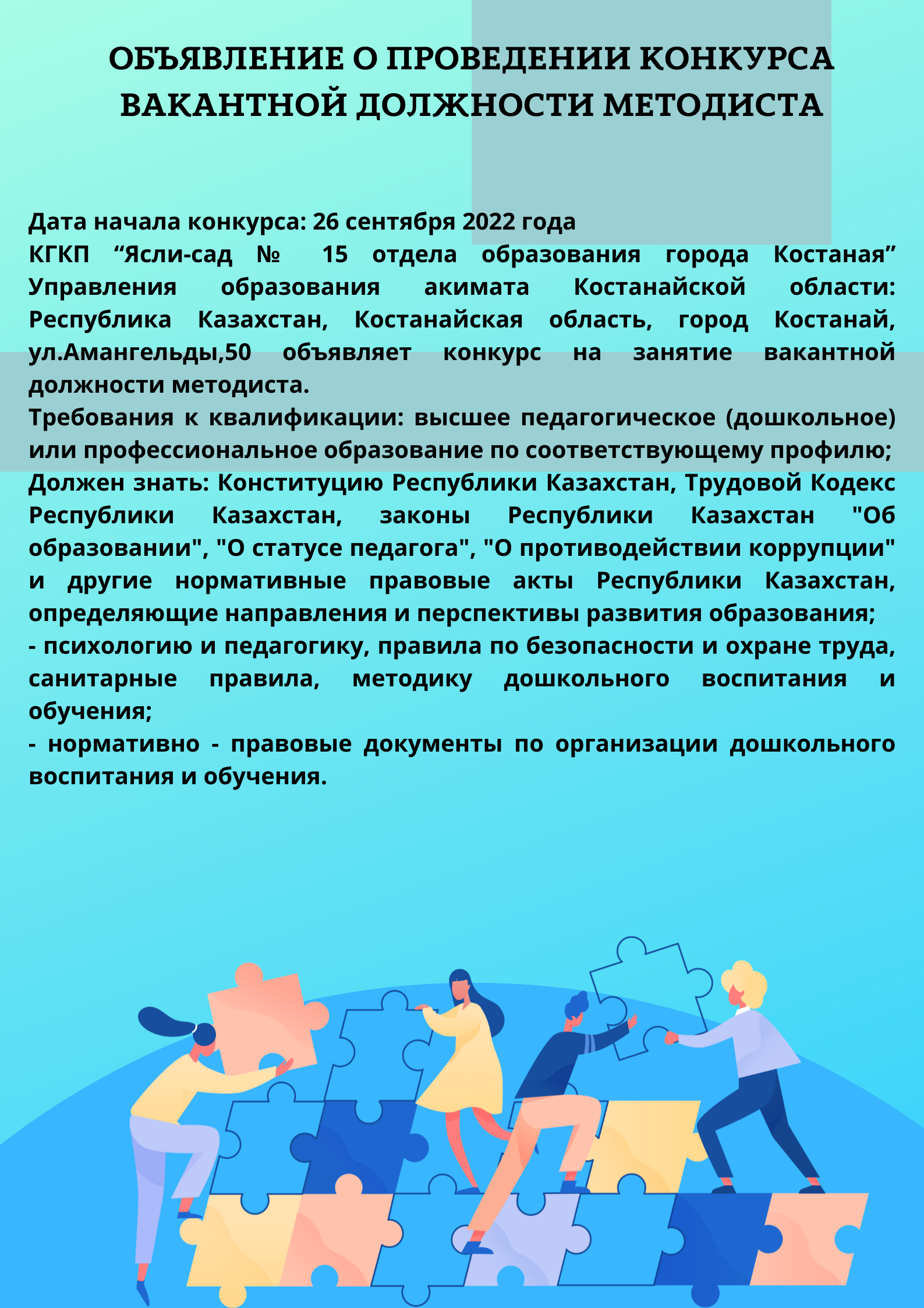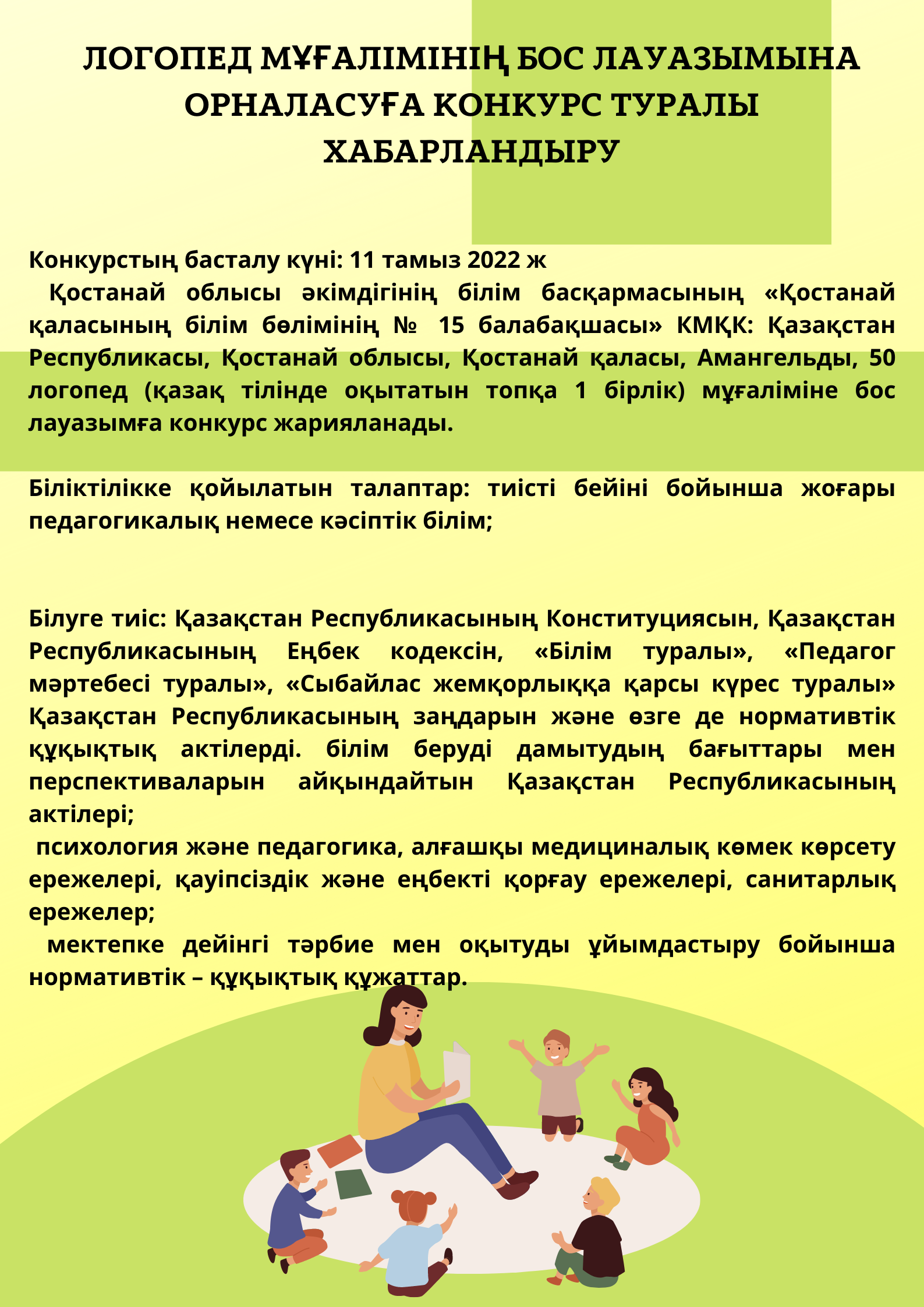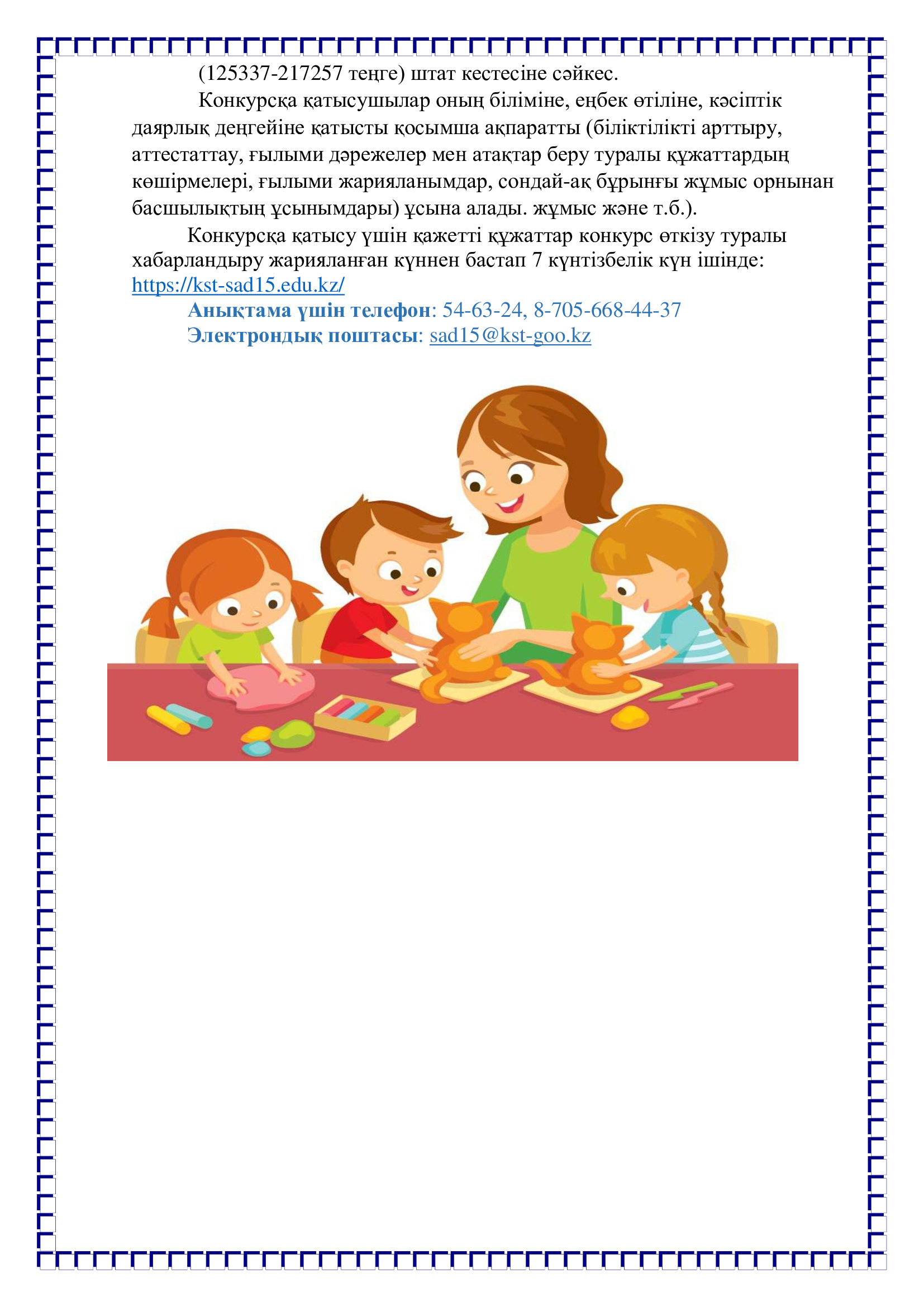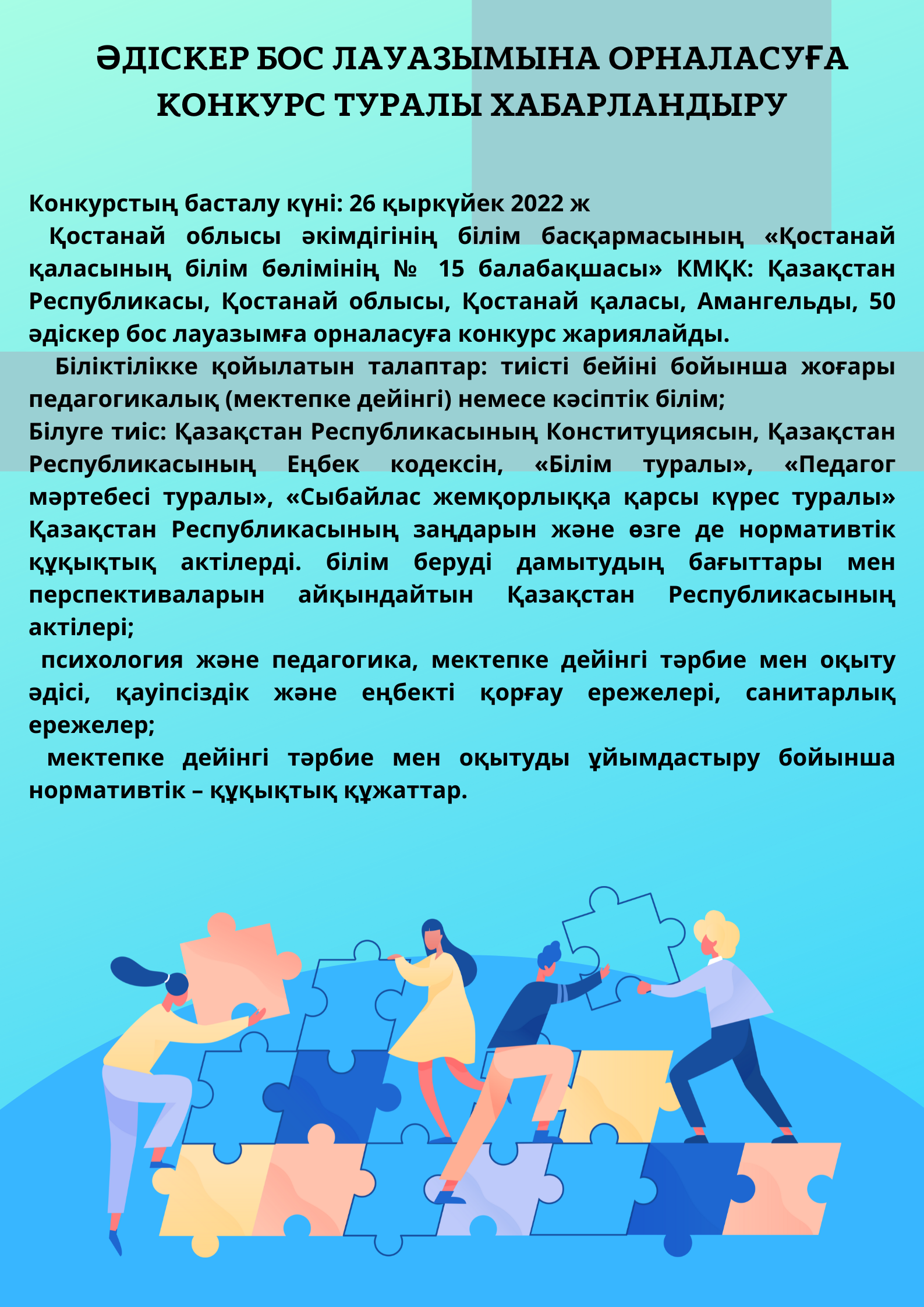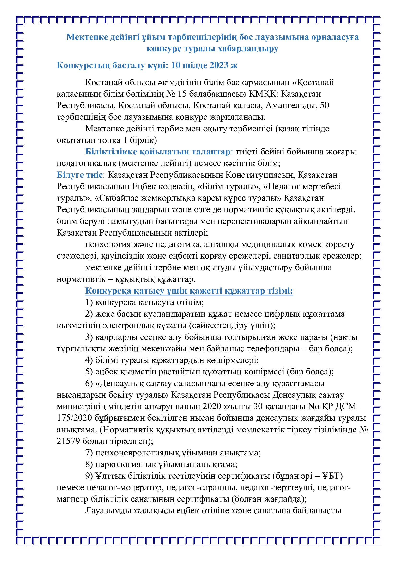 Конкурсқа қатысу үшін қажетті құжаттар конкурс өткізу туралы хабарландыру жарияланған күннен бастап 7 күнтізбелік күн ішінде: https://kst-sad15.edu.kz/