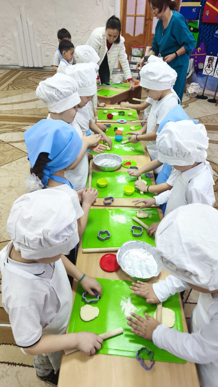 ˝Аспазшы ˝ мамандығын пішіндерді пайдаланып В.Глеб,Р.Әмір,Т.Алинур,А.Умар печенье жасап ,қалған балаларда қамыр илеп өз әрекеттерін жасап шықты.
