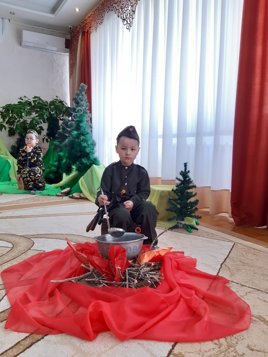Балабақша тәрбиеленушілері сахнаға шығып: демалуын, жараланғандарға медициналық көмек көрсетілуін, туған-туыстарына хат жазуын, түскі ас дайындауын көрсете білді.